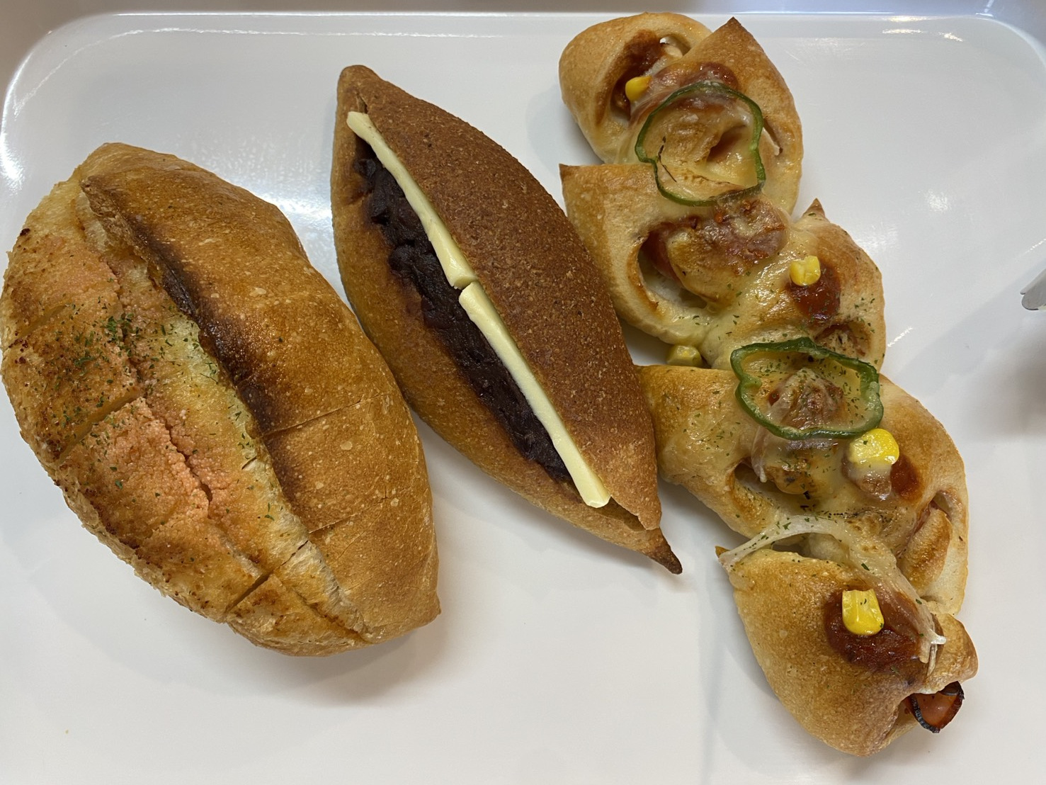 また、写真の真ん中にある「全粒粉のあんバター」(180円)や写真の右にある「ベーコンえっピザ」(300円)もおススメです!